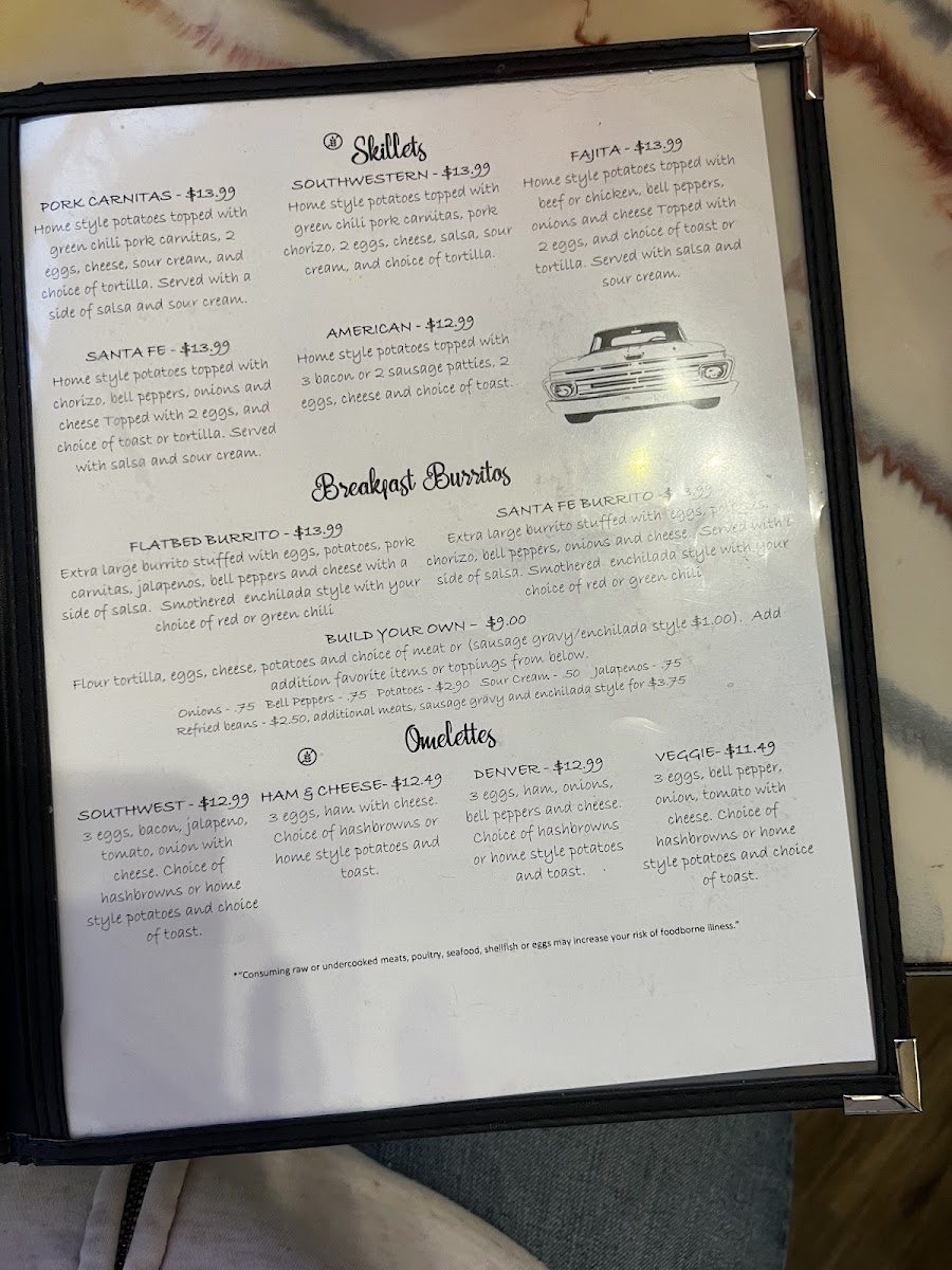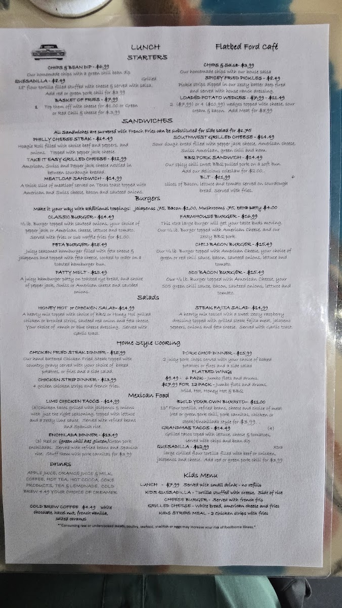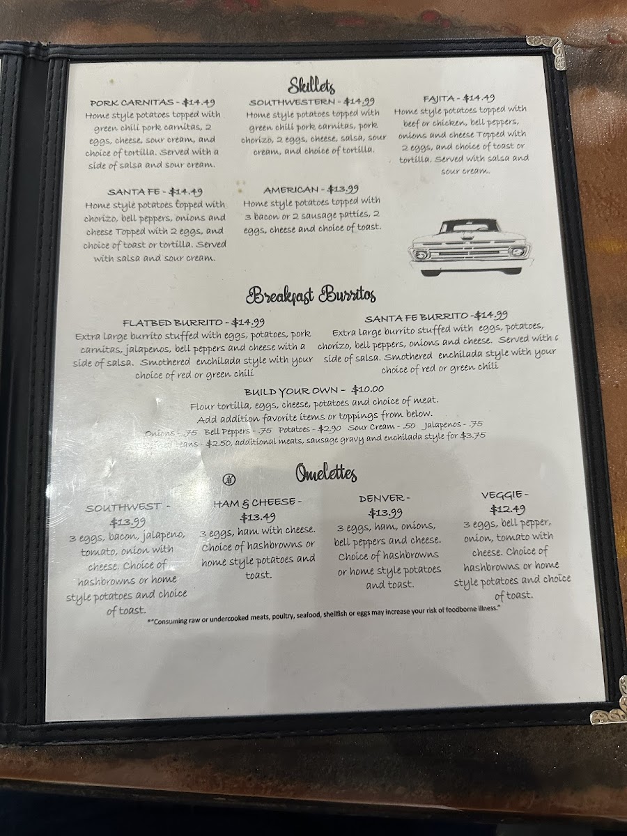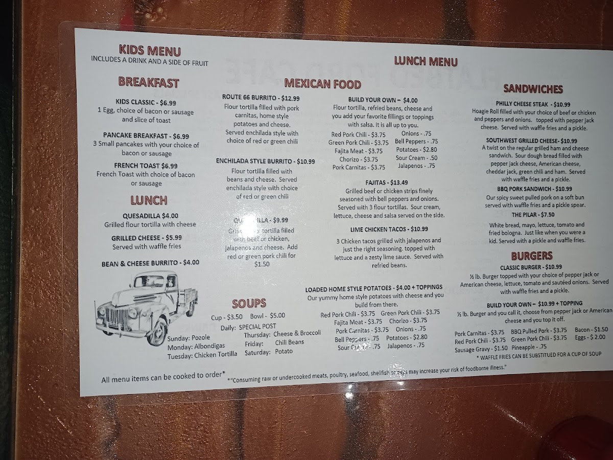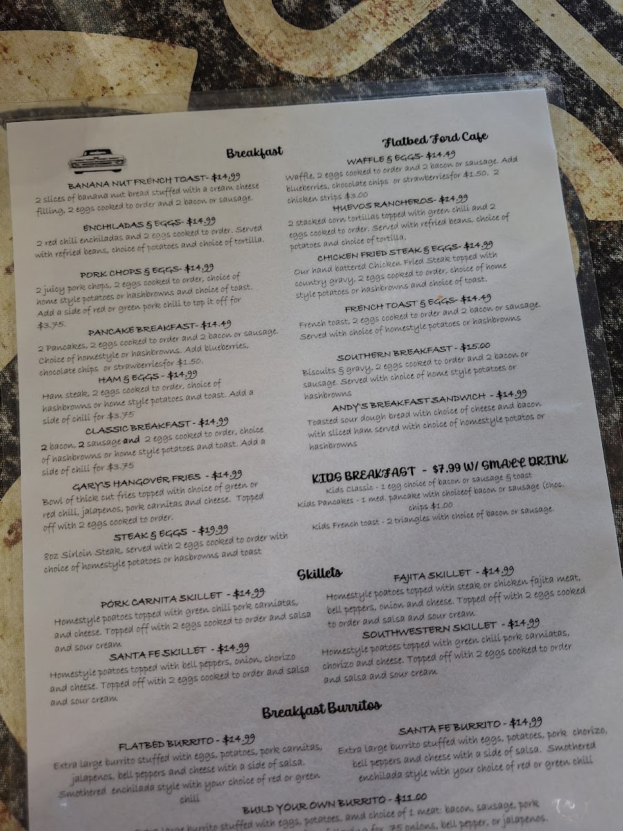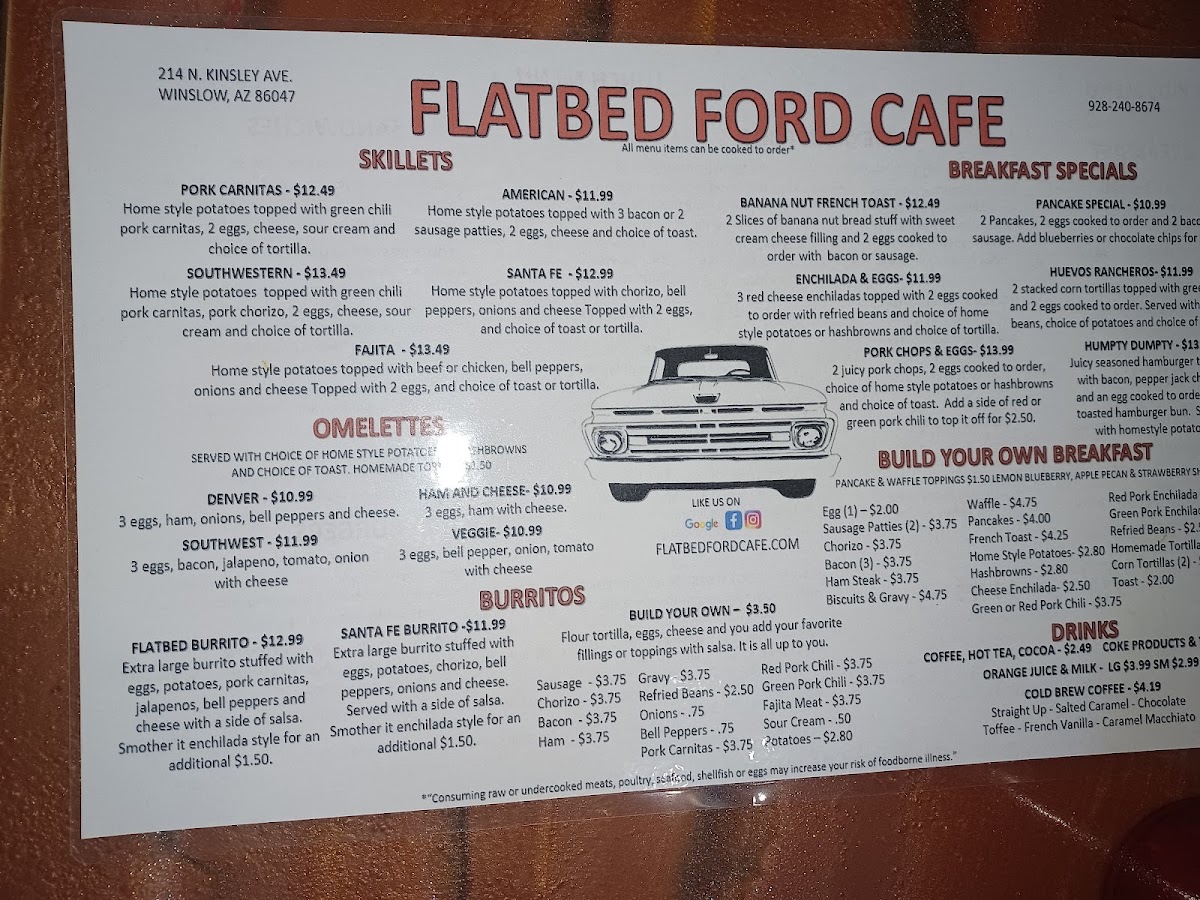 Welcome to Flatbed Ford Cafe, a cozy gem nestled in Winslow, Arizona. This charming cafe offers a mouthwatering menu that focuses primarily on breakfast delights, making it a must-visit for morning enthusiasts. The standout items include the hearty Pulled Pork Breakfast Skillet, featuring perfectly cooked home style potatoes smothered with green chili pork carnitas, topped with eggs and cheese, ensuring a fulfilling start to your day.